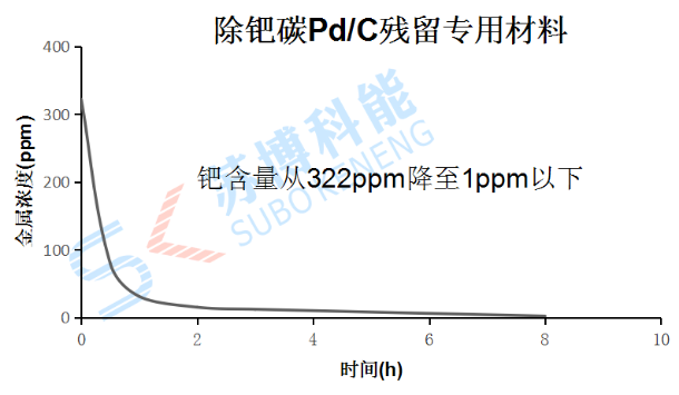 加入寧波蘇博科能少量吸附材料進(jìn)行攪拌過(guò)濾,3h后能將鈀殘留降低到10ppm以下,攪拌6h將鈀殘留從322ppm降低到1ppm以下。