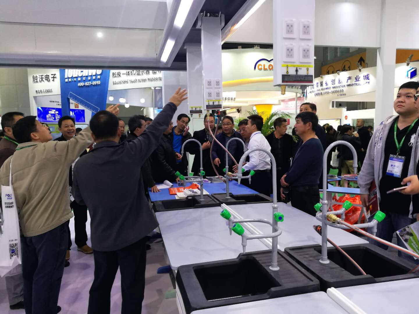 新科展位頂裝式可升降集成系統(tǒng)—智慧創(chuàng)新學(xué)科實驗室吸引了大批客戶前來參觀、咨詢和拍照。營銷人員正在精彩的講解。