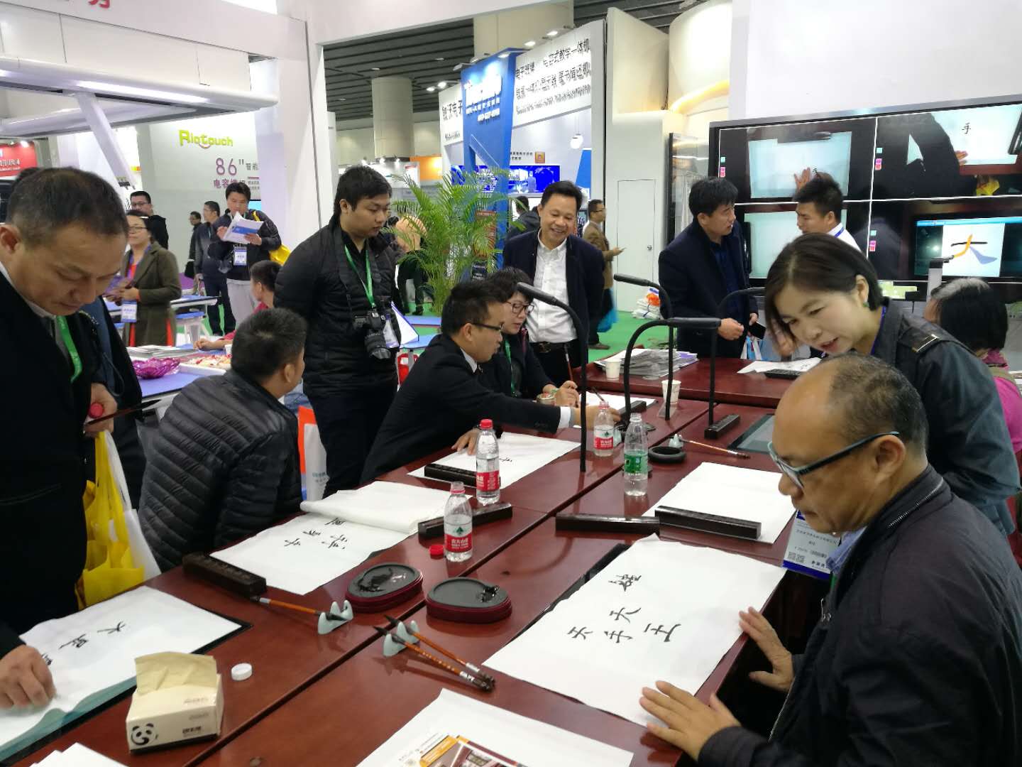 全息數(shù)字化書法臺借助現(xiàn)代科技力量的同時又吸取傳統(tǒng)文化的精髓,學(xué)校領(lǐng)導(dǎo)在現(xiàn)場臨摹體驗。